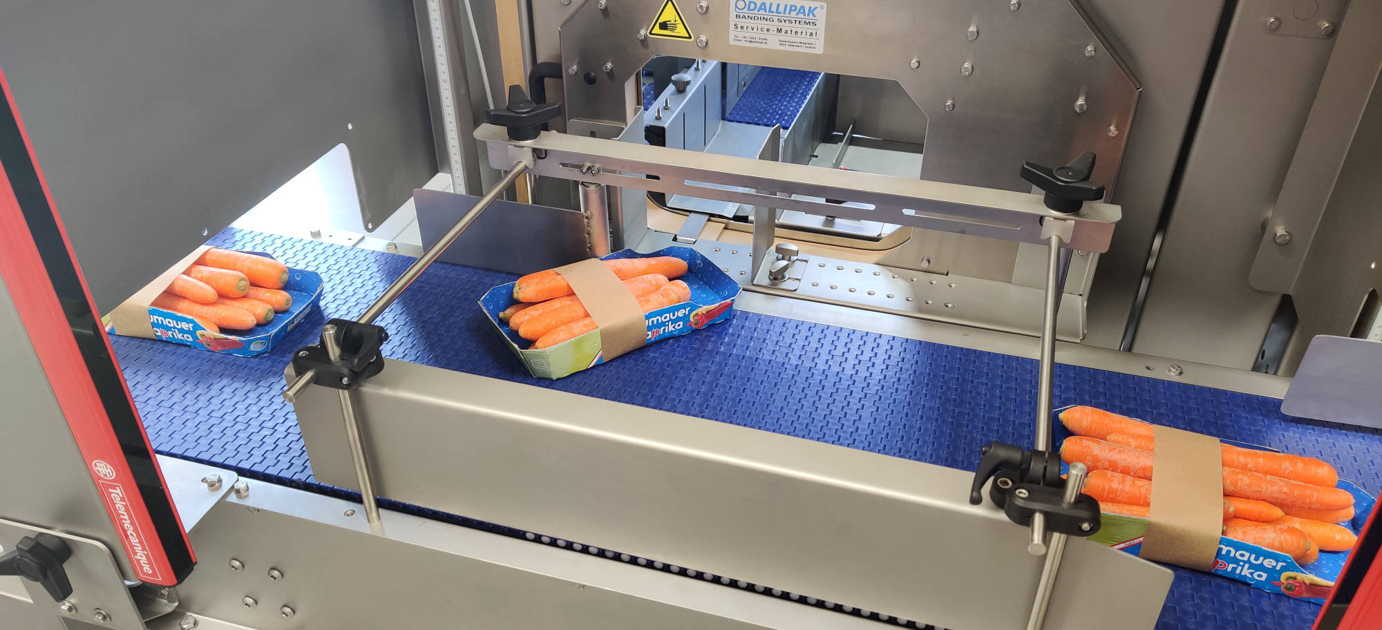 Die Produkte werden nach der Zuführung durch einen Separator getrennt und auf zwei Zufuhrförderern abgelegt, die jeweils zu einer der beiden Banderoliereinheiten führen. Die Produkte werden dann einzeln banderoliert.